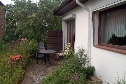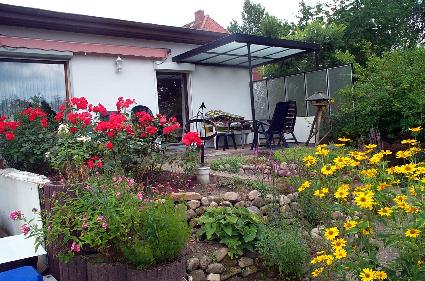 Die Rückfront des Hauses mit überdachter Terrasse und Markise zur Westseite (Abendsonne)